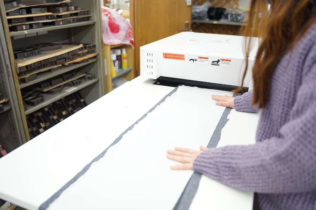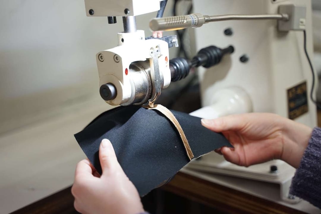 帽子を立体的に仕上げる為に最適な芯地を選択しラミネートします。